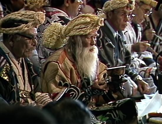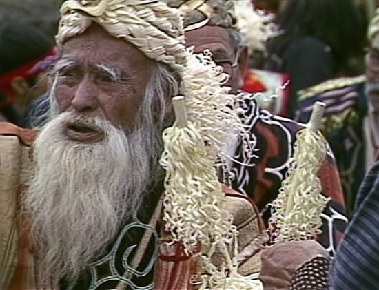 【司祭者:日川善次郎】1911年生まれ。日高・沙流川地方、振内(ふれない)の出身で、各地を放浪したあと屈斜路湖畔に暮らし、民芸店を営む。不世出のアイヌ神事の伝承者として知られ、カムイノミができる数少ない古老として、道内各地の儀式で祭司を務めた。1990年に79歳で逝去。妻キヨもアイヌ歌謡とムックリ(口琴)の名手であった。